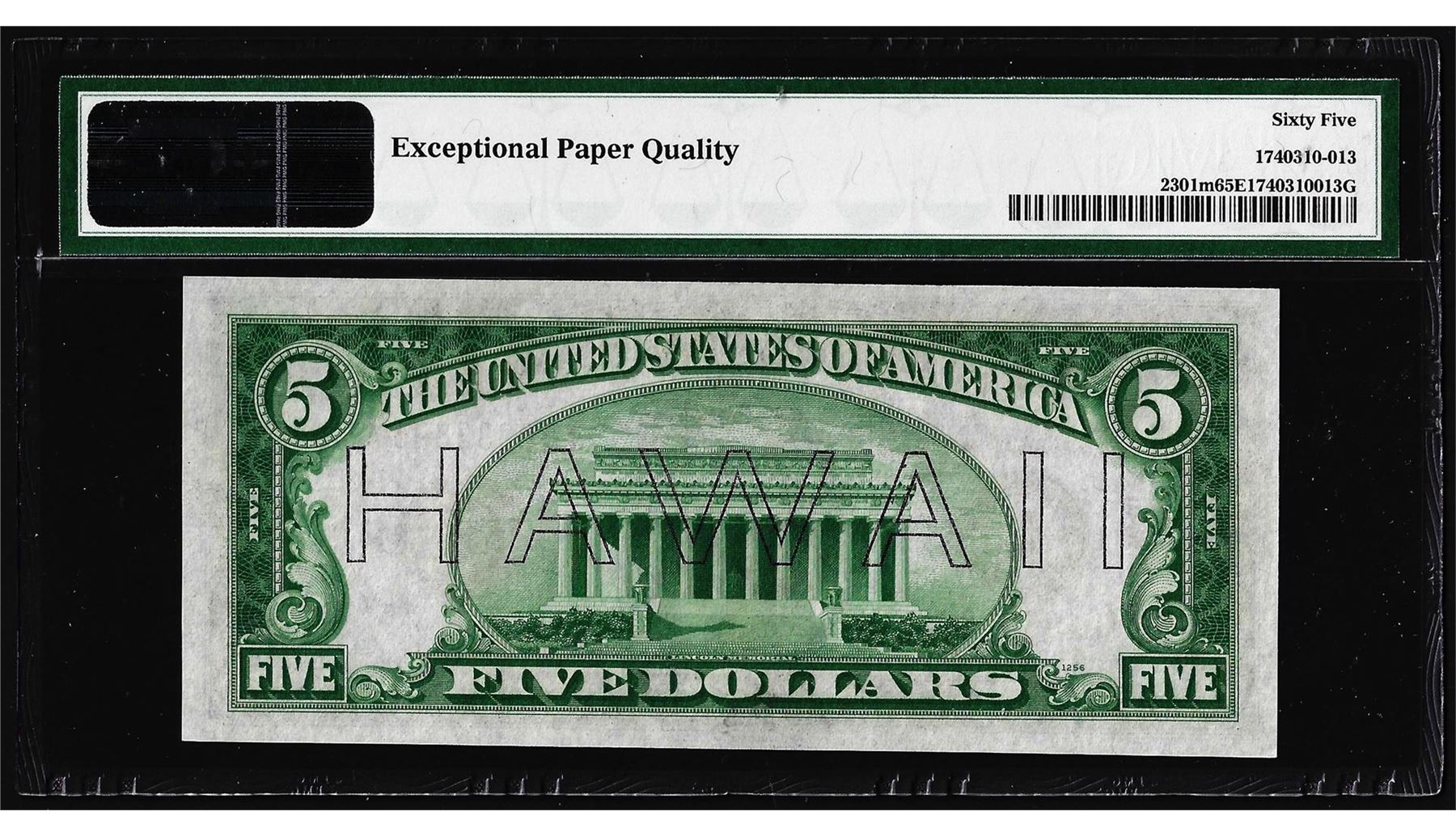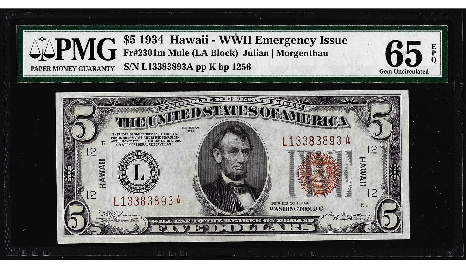 One 1934 $5 Hawaii WWII Emergency Issue Federal Reserve Note PMG Gem Uncirculated 65EPQ. PMG Certified.