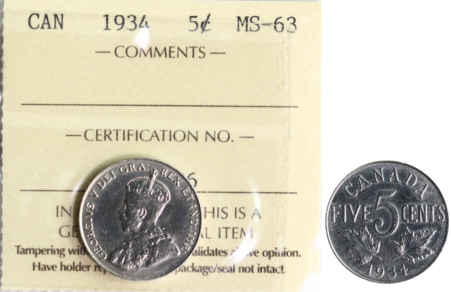 1934 5¢ ICCS Choice Mint State-63 Well struck with nice surfaces and strong lustre. A better date.