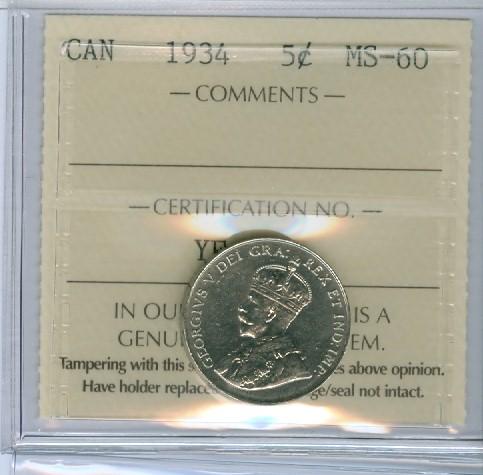 1934 5¢ ICCS MS60. Difficult issue in any mintstate grade.