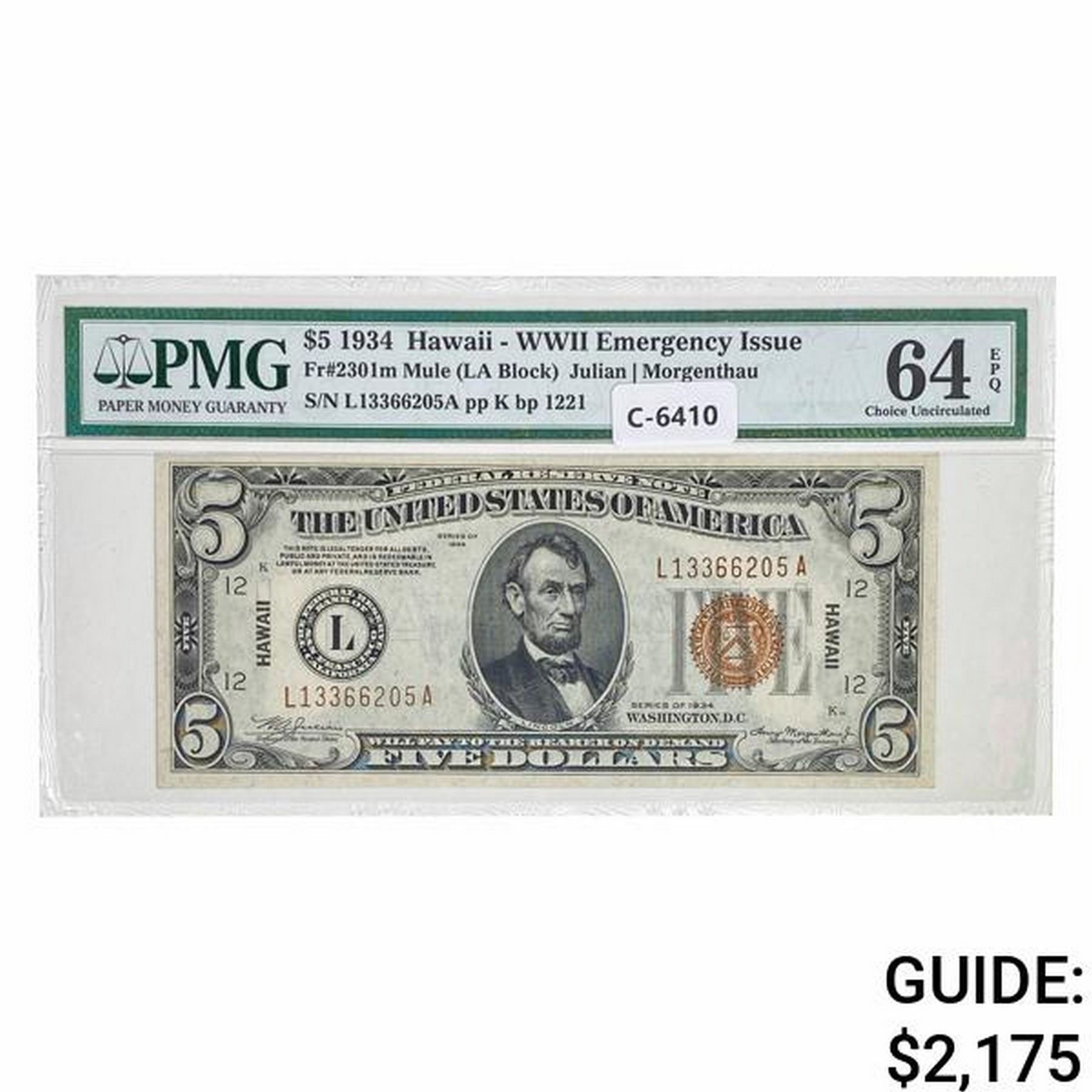 1934 $5 MULE HAWAII FRN PMG UNC-64EPQ