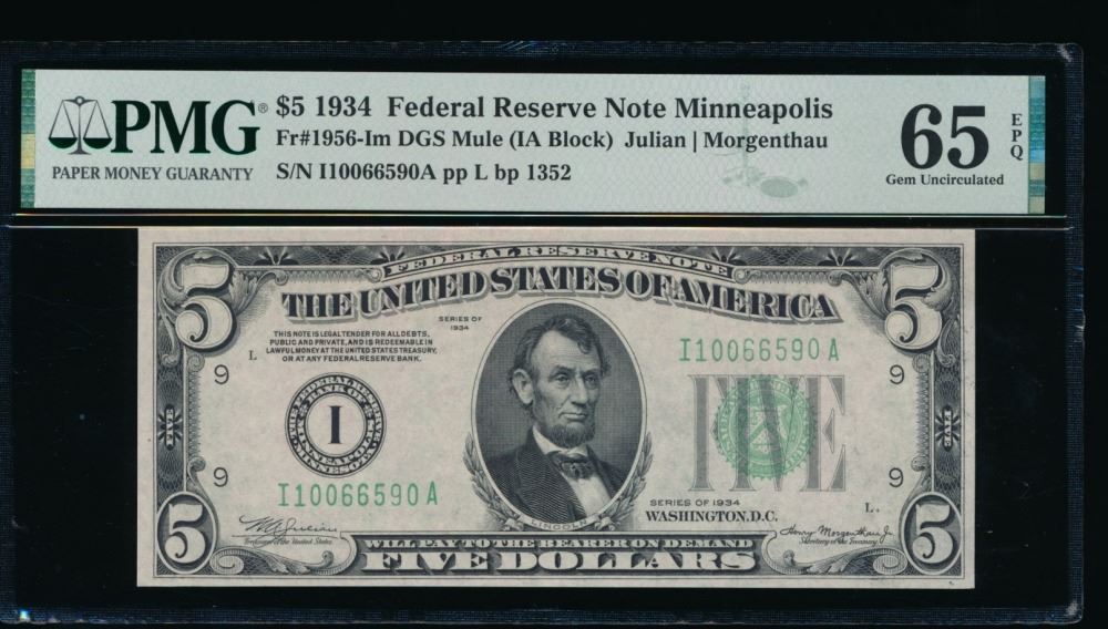 One 1934 $5 Minneapolis FRN PMG 65EPQ.