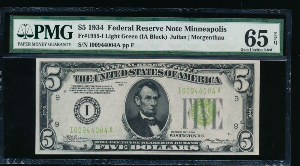 One 1934 $5 Minneapolis Federal Reserve Note PMG 65EPQ.