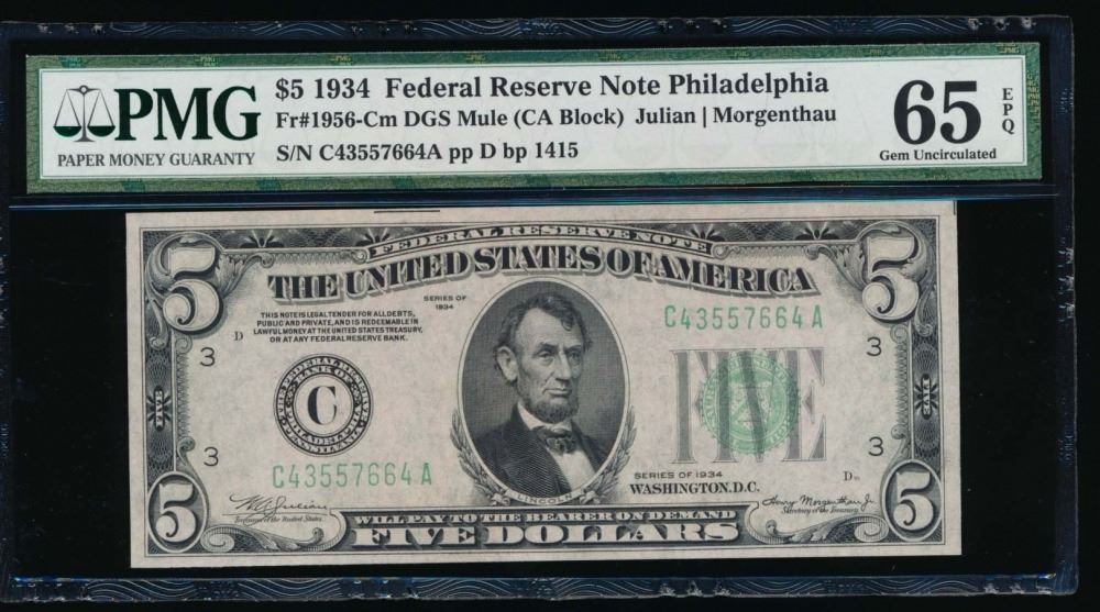 One 1934 $5 Philadelphia Federal Reserve Note PMG 65EPQ.