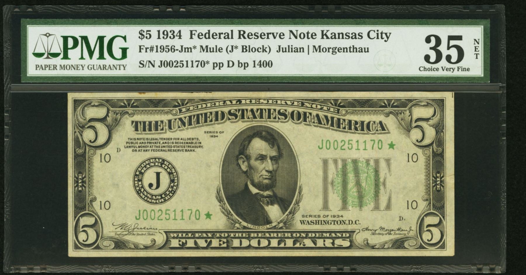 One 1934 $5 STAR Kansas City FRN PMG 35NET.