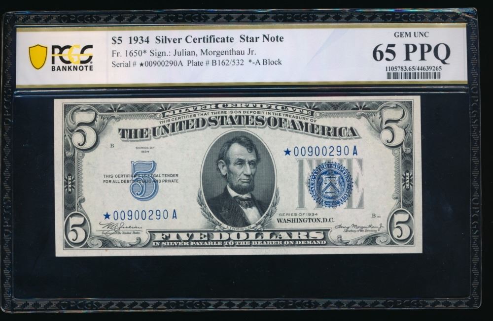 One 1934 $5 STAR Silver Certificate PCGS 65PPQ.