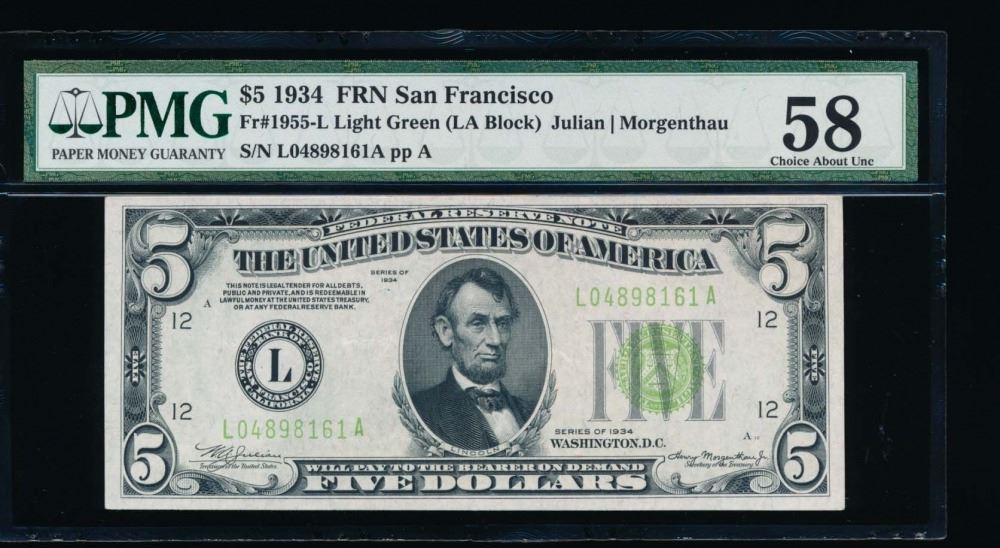 One 1934 $5 San Francisco Federal Reserve Note PMG 58.