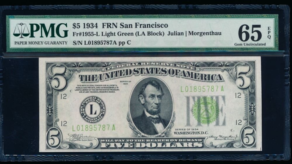 One 1934 $5 San Francisco Federal Reserve Note PMG 65EPQ.