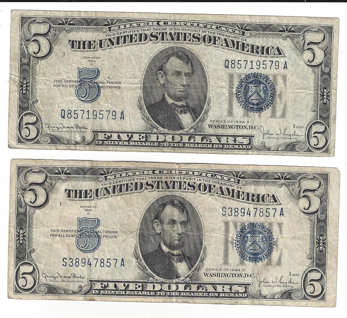 1934 $5 Silver Certificate Currency Lot of 2.