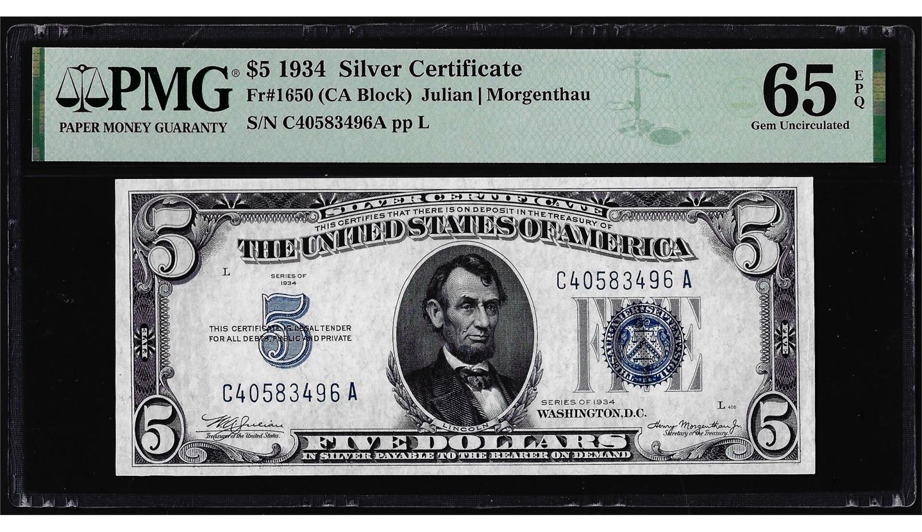 One 1934 $5 Silver Certificate Note Fr.1650 PMG Gem Uncirculated 65EPQ. PMG Certified.