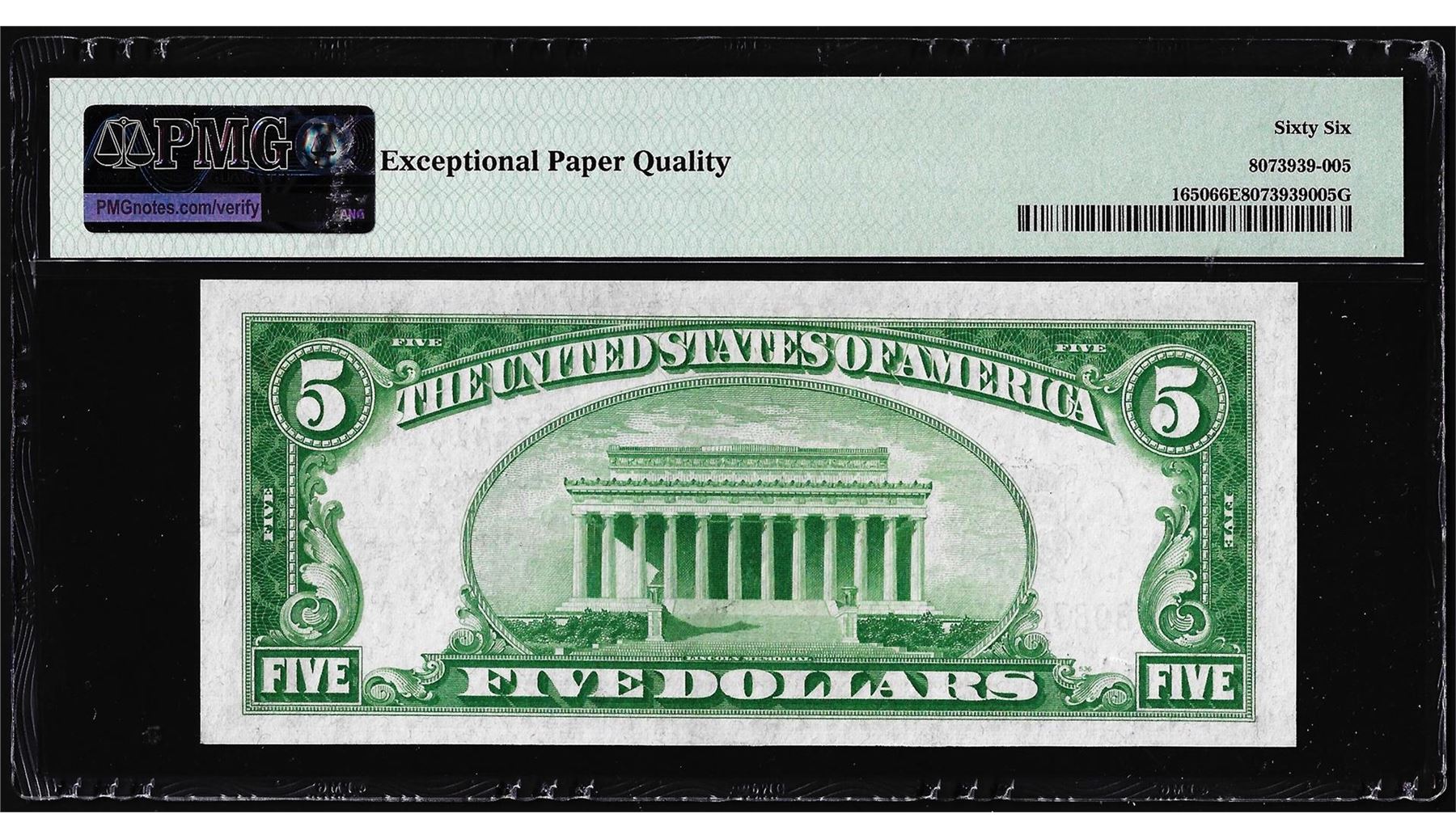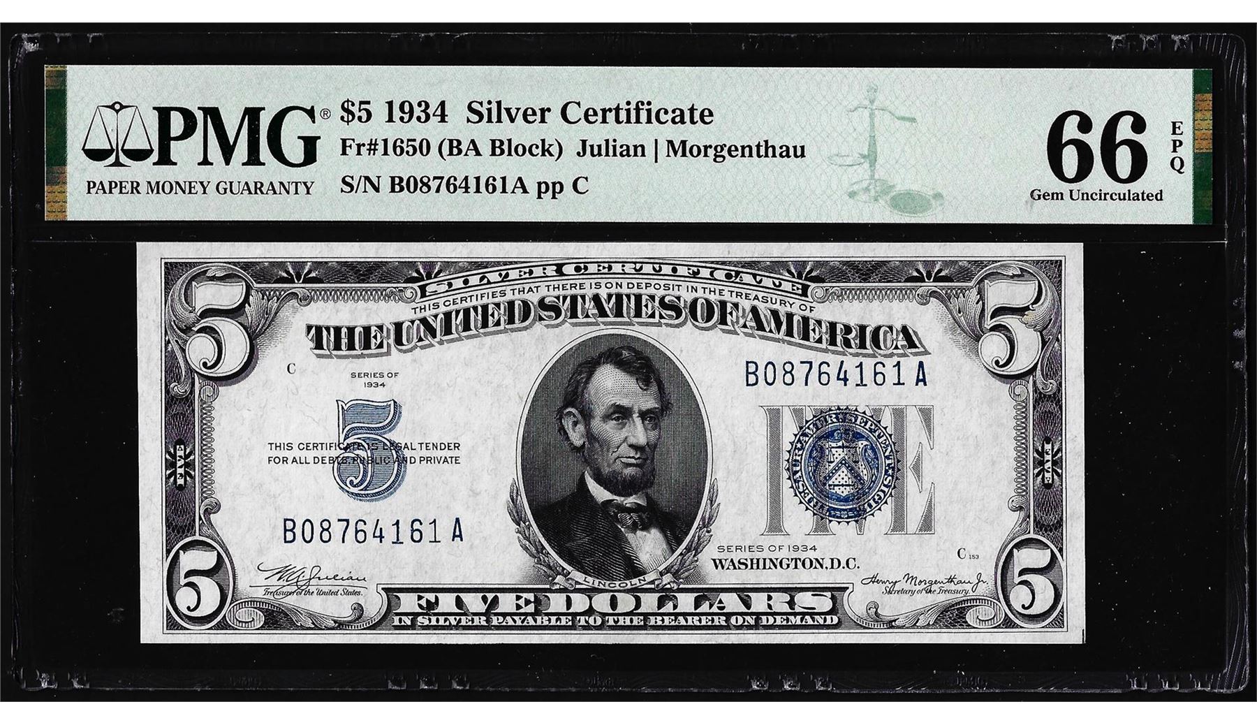 One 1934 $5 Silver Certificate Note Fr.1650 PMG Gem Uncirculated 66EPQ. PMG Certified.