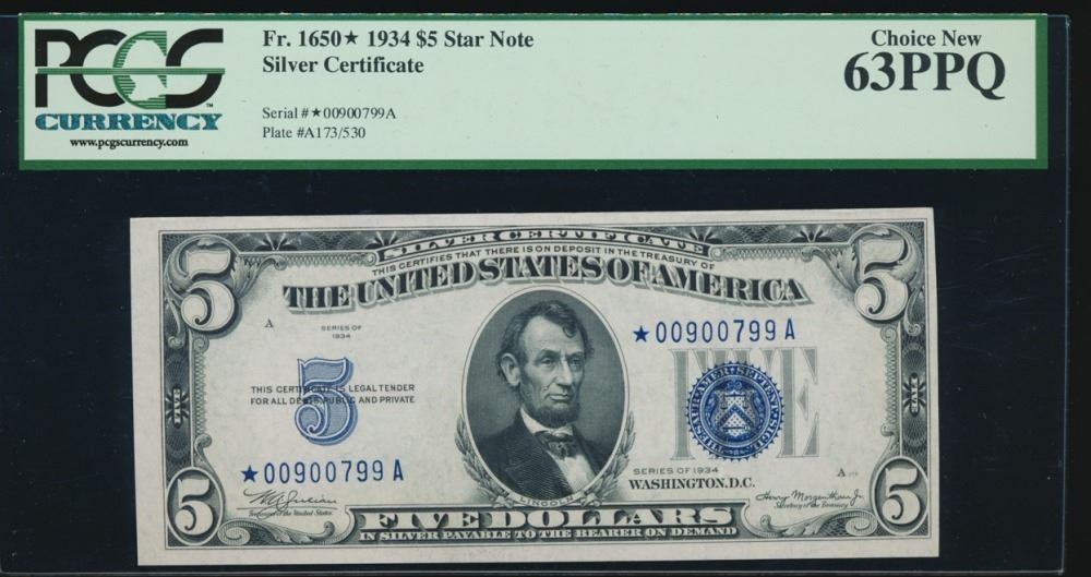 One 1934 $5 Silver Certificate PCGS 63PPQ.