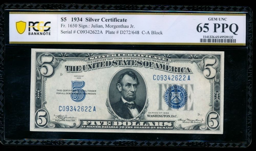 One 1934 $5 Silver Certificate PCGS 65PPQ.