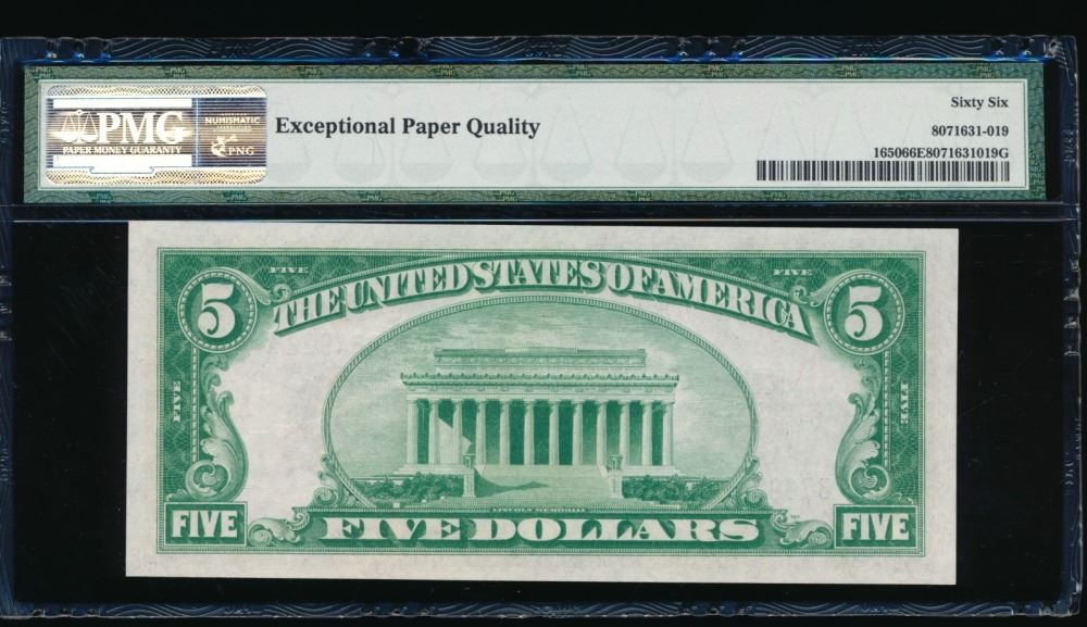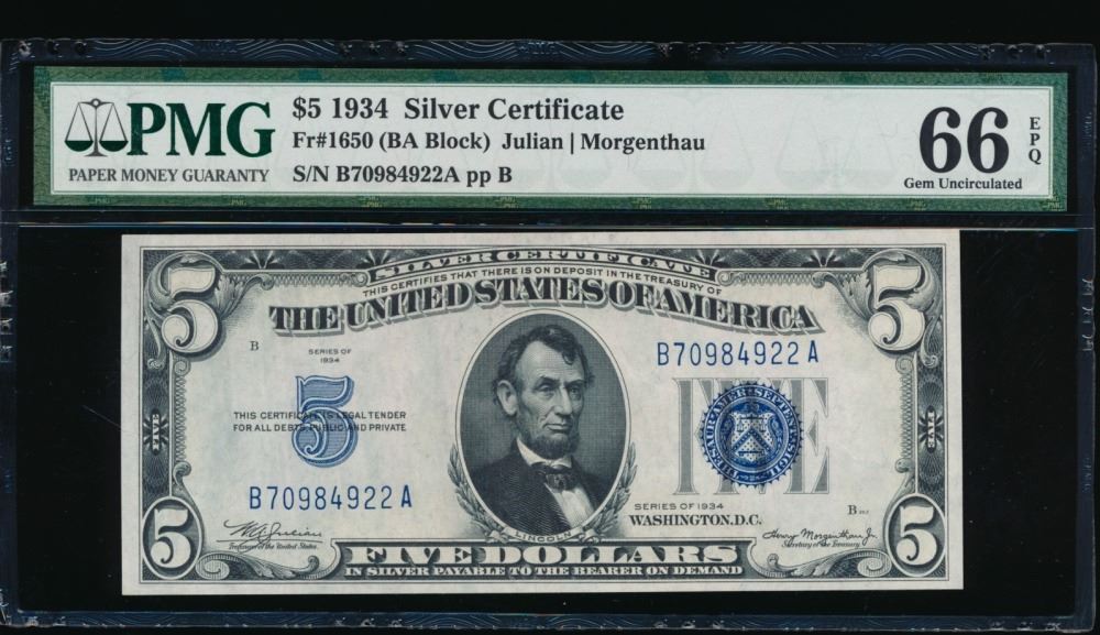 One 1934 $5 Silver Certificate PMG 66EPQ.