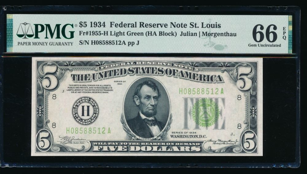 One 1934 $5 St Louis FRN PMG 66EPQ.