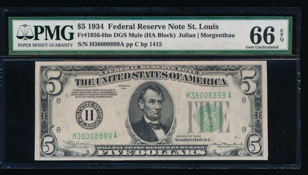 One 1934 $5 St Louis Federal Reserve Note PMG 66EPQ.