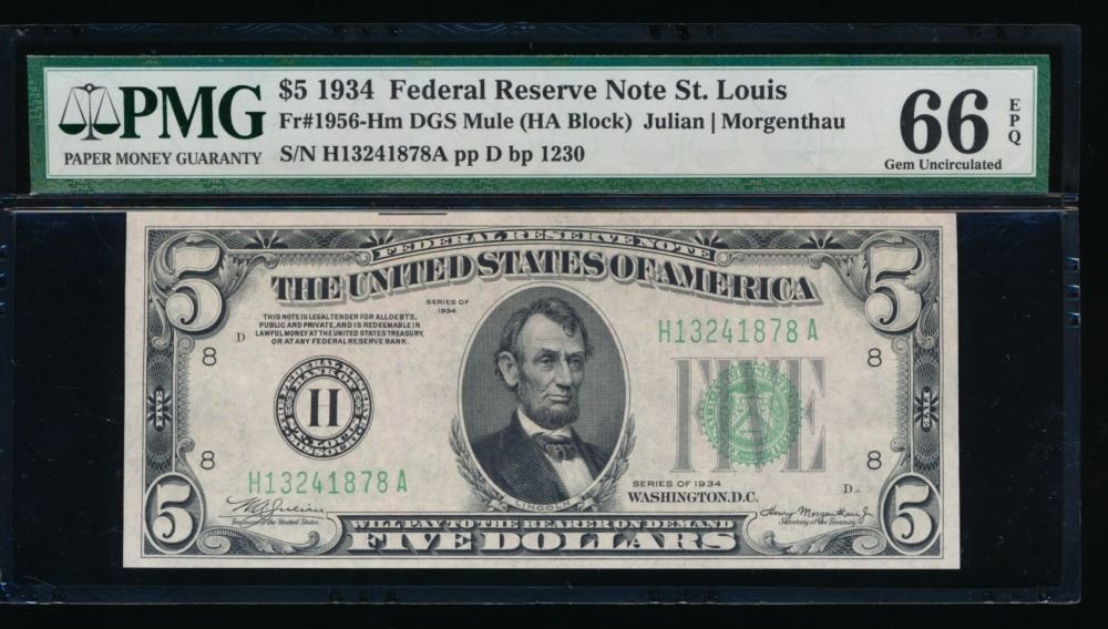One 1934 $5 St Louis Federal Reserve Note PMG 66EPQ.