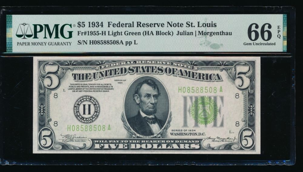 One 1934 $5 St Louis Federal Reserve Note PMG 66EPQ.