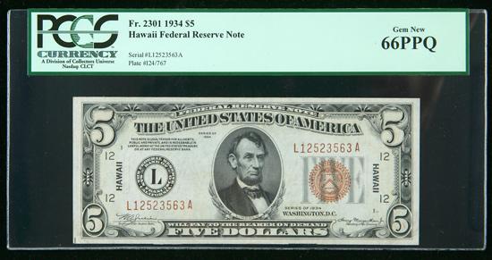1934, $5 World War II Emergency Note. Hawaii. . Fr-2301. . KL-1960. PCGS Gem New 66PPQ. This lovely Hawaii overprint Five is a spectacular Gem in every respect, with broad, even margins, bold embossing, and strictly original paper surfaces that earned PCGS Currency's coveted PPQ designation for "premium paper quality." This is the only 66PPQ graded to date by PCGS Currency, with only a single example (a 67PPQ) finer. The eighth edition of the Small-Size U.S. Paper Money reference catalogs this non-mule variety at $5,000 in Gem CU, a price level that could easily be exceeded by this lovely example.