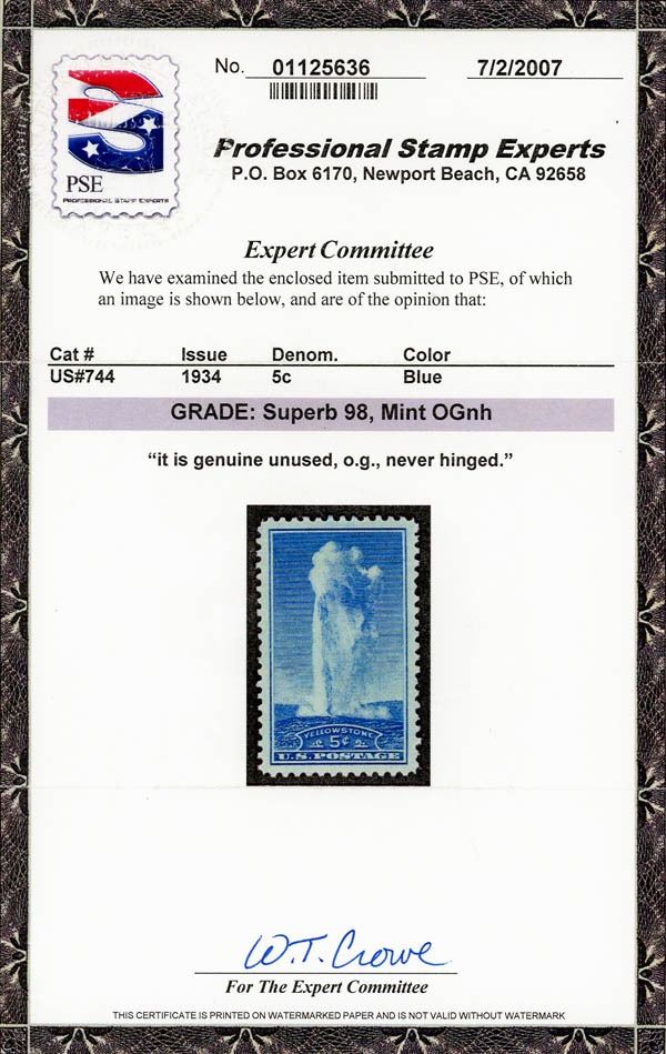 1934, 5¢ Yellowstone National Park, perforated. Scott 744. SMQ $120, Sup, with 2007 P.S.E. certificate graded SUP 98