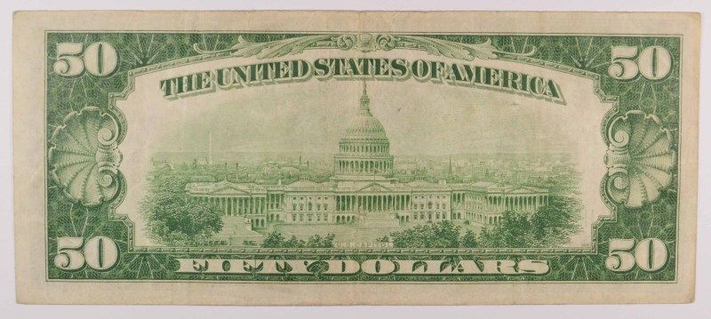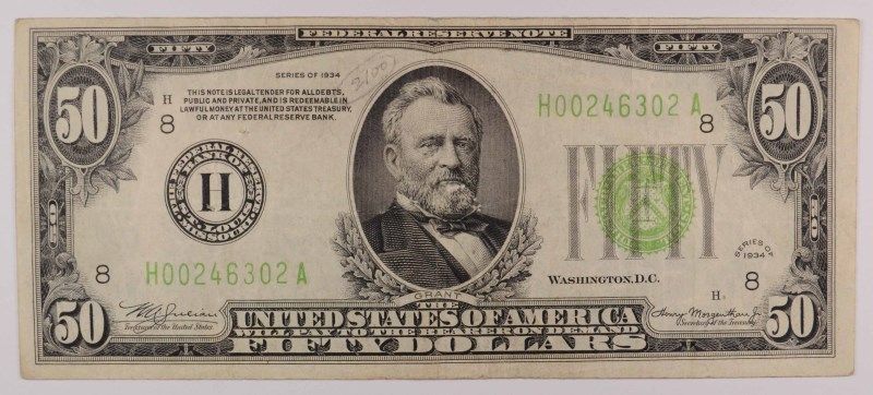 1934 $50.00 FEDERAL RESERVE NOTE, VF/XF ( pin holes )