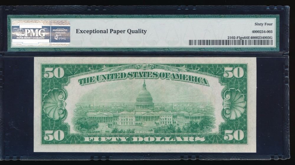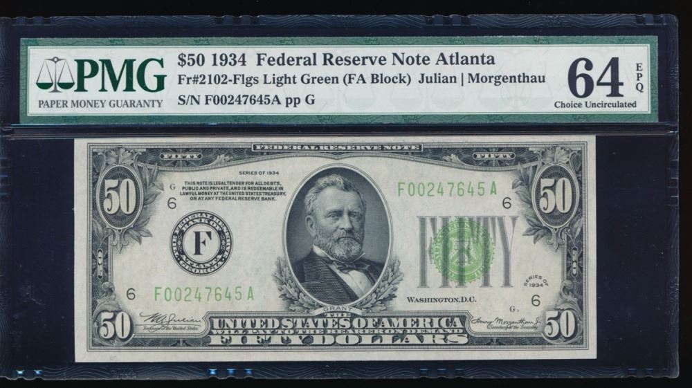 One 1934 $50 Atlanta Federal Reserve Note PMG 64EPQ.