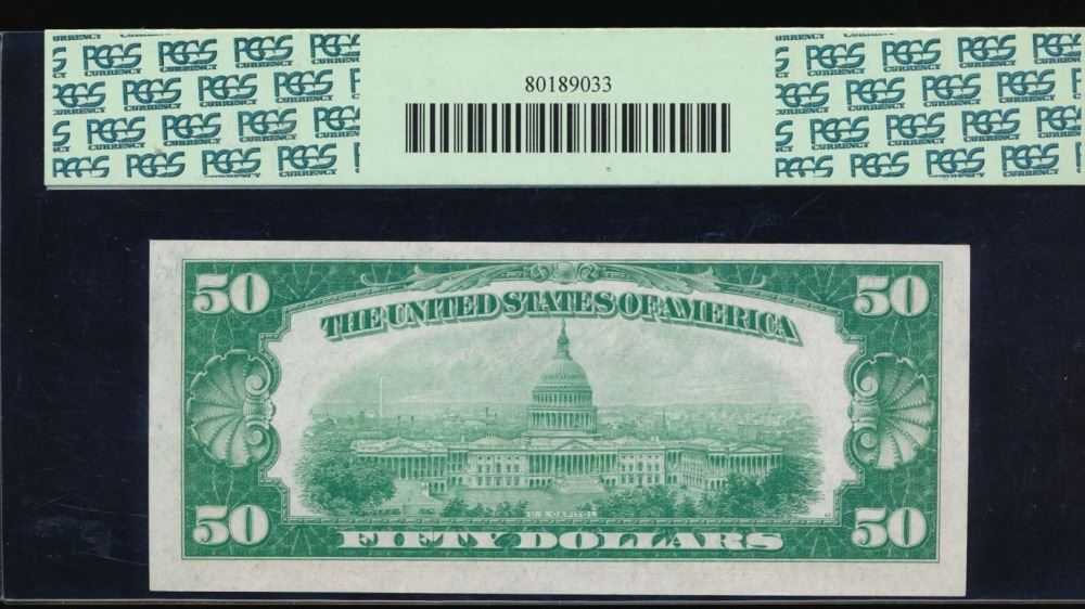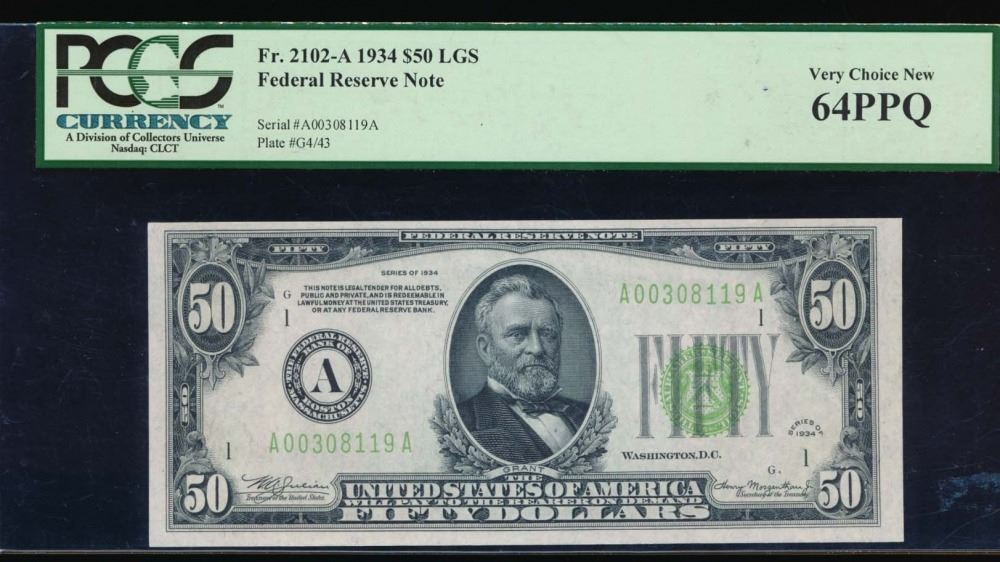 One 1934 $50 Boston Federal Reserve Note PCGS 64PPQ.