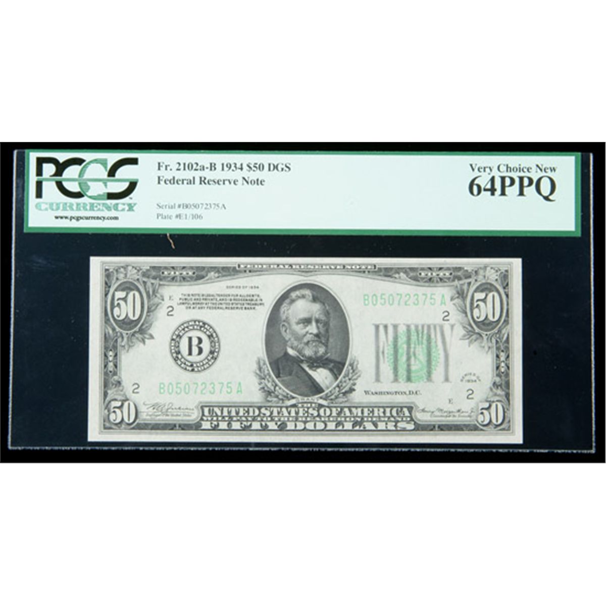 1934, $50 Federal Reserve Note. DGS. PCGS Very Choice New 64PPQ. . Fr-2102a-B. A lovely, pack fresh example with wonderful originality.