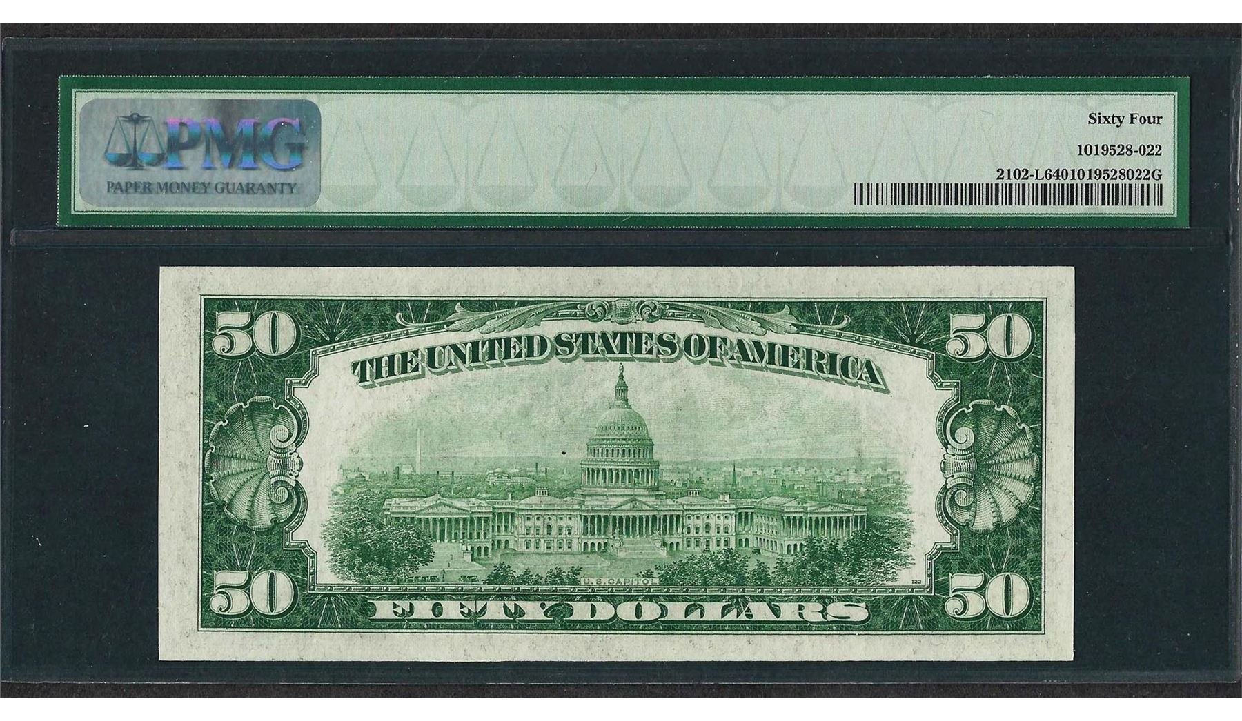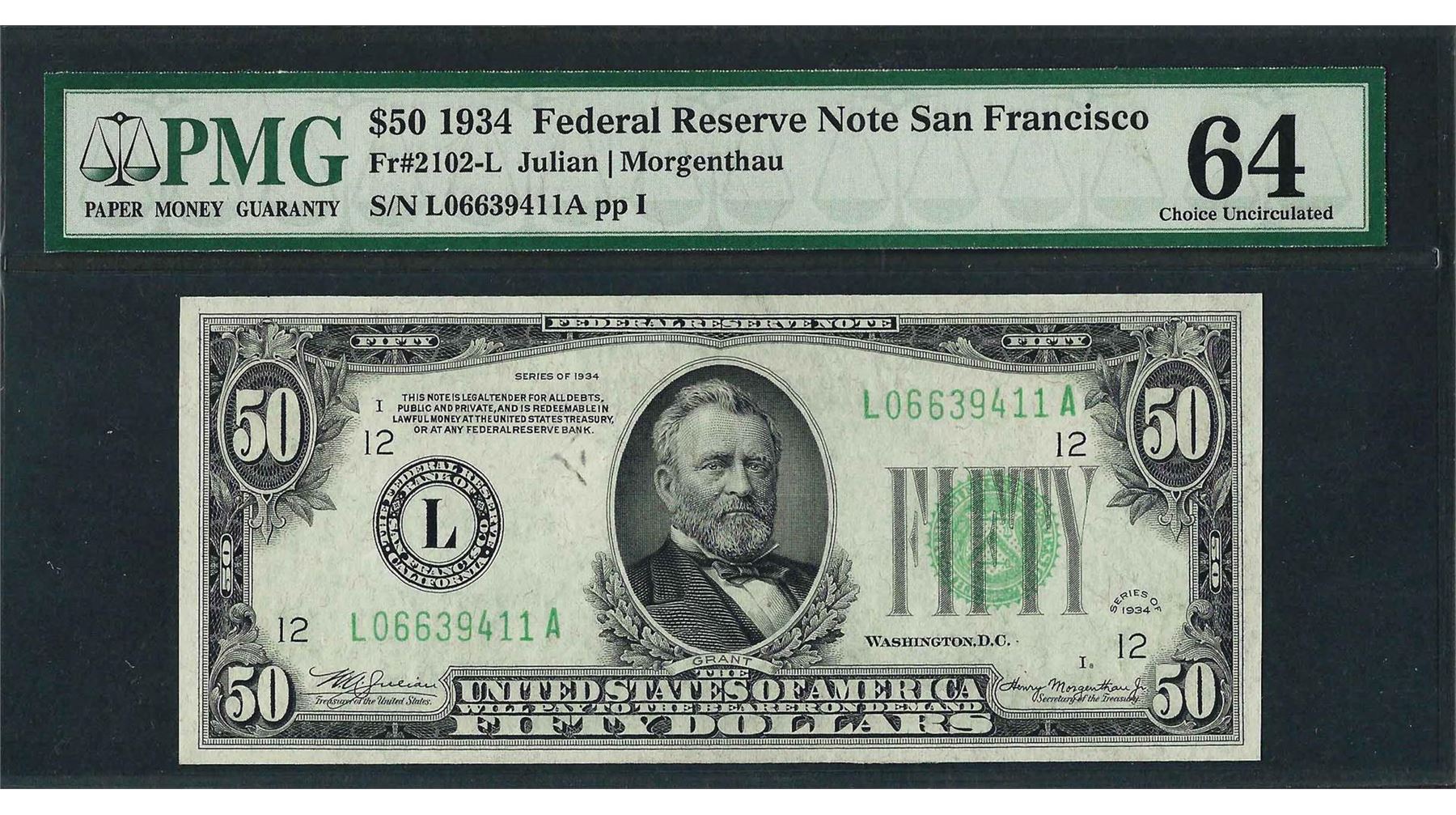 One 1934 $50 Federal Reserve Note San Francisco Fr.2102-L PMG Choice Uncirculated 64. PMG Certified.