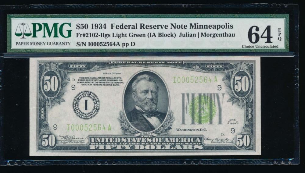 One 1934 $50 Minneapolis Federal Reserve Note PMG 64EPQ.