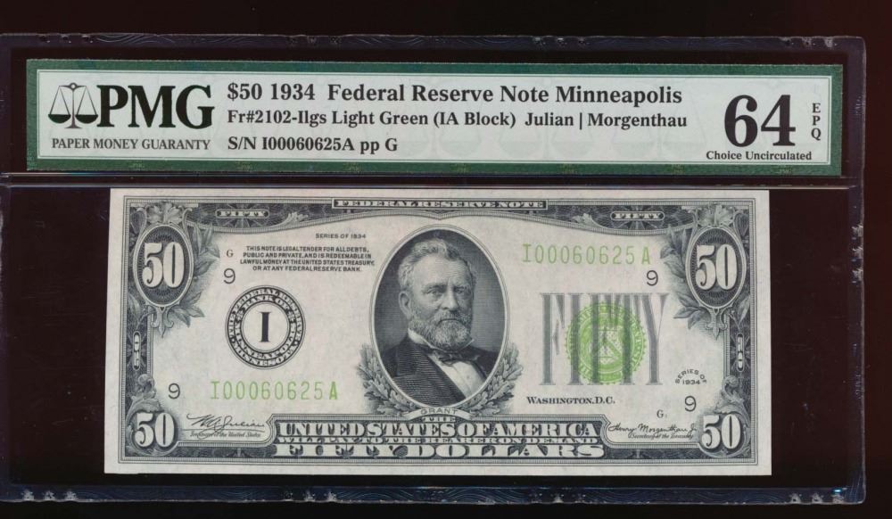 One 1934 $50 Minneapolis Federal Reserve Note PMG 64EPQ.