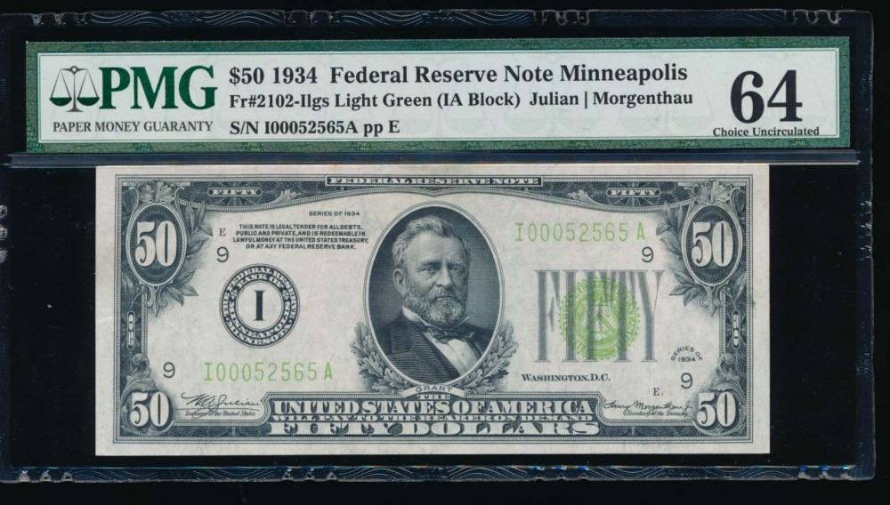 One 1934 $50 Minneapolis Federal Reserve Note PMG 64.