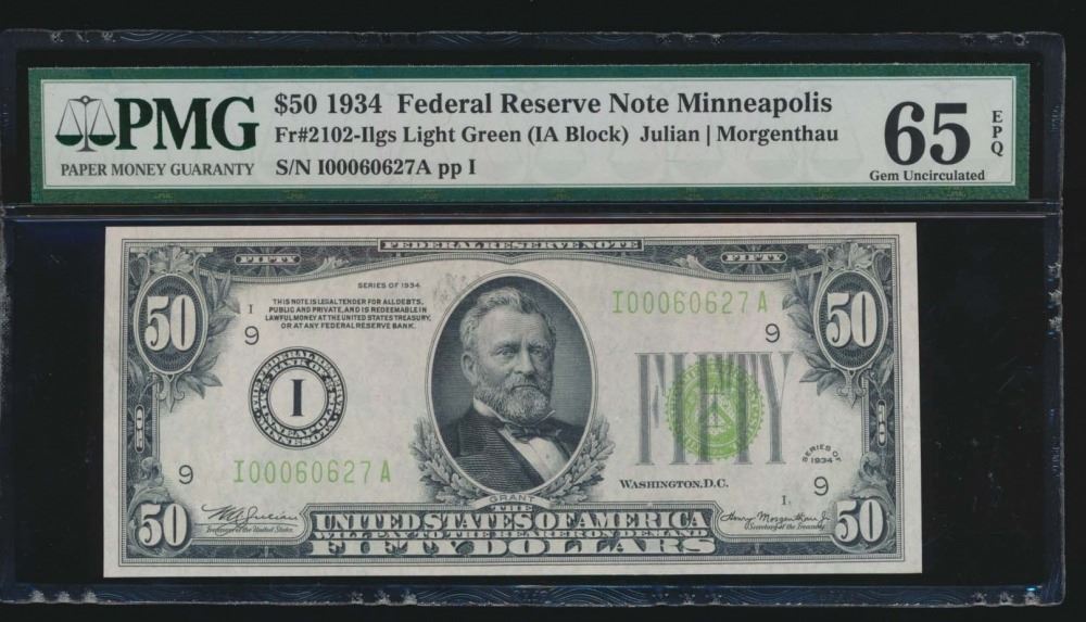 One 1934 $50 Minneapolis Federal Reserve Note PMG 65EPQ.