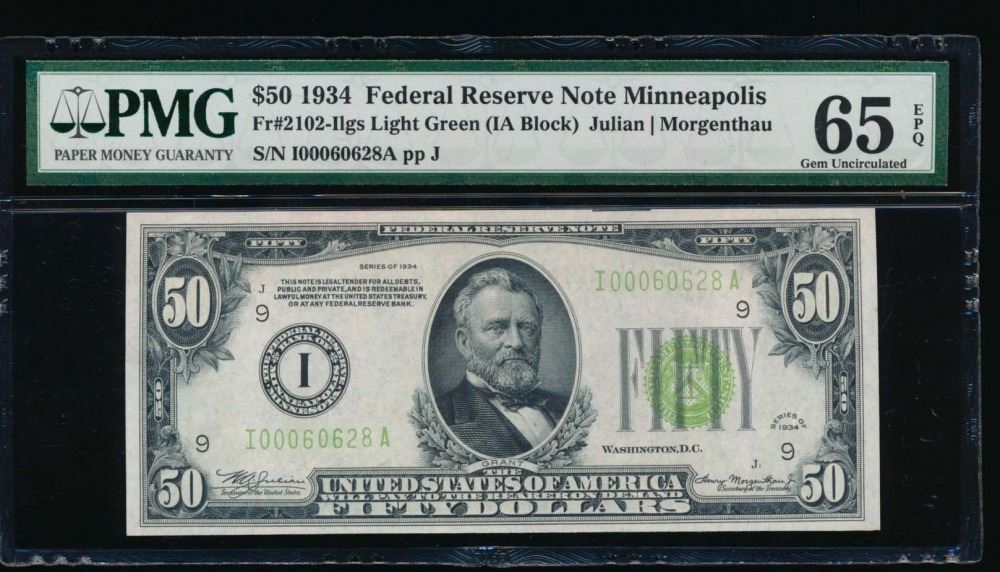 One 1934 $50 Minneapolis Federal Reserve Note PMG 65EPQ.