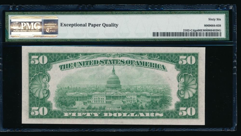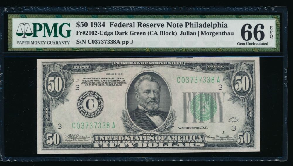 One 1934 $50 Philadelphia FRN PMG 66EPQ.