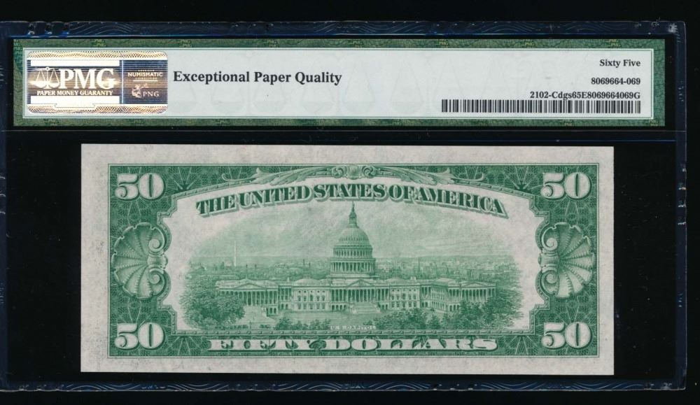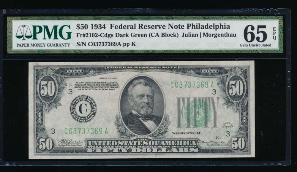 One 1934 $50 Philadelphia Federal Reserve Note PMG 65EPQ.