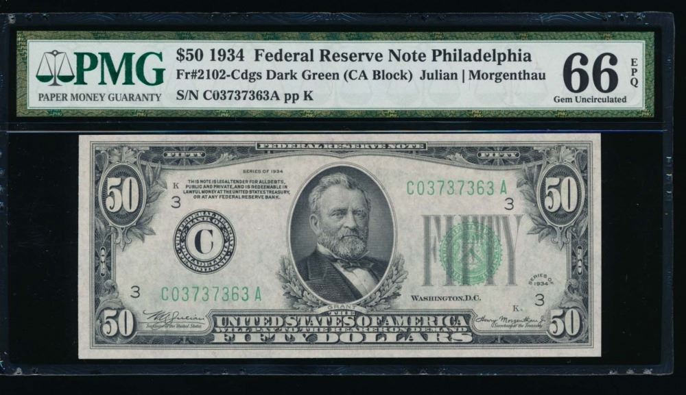 One 1934 $50 Philadelphia Federal Reserve Note PMG 66EPQ.