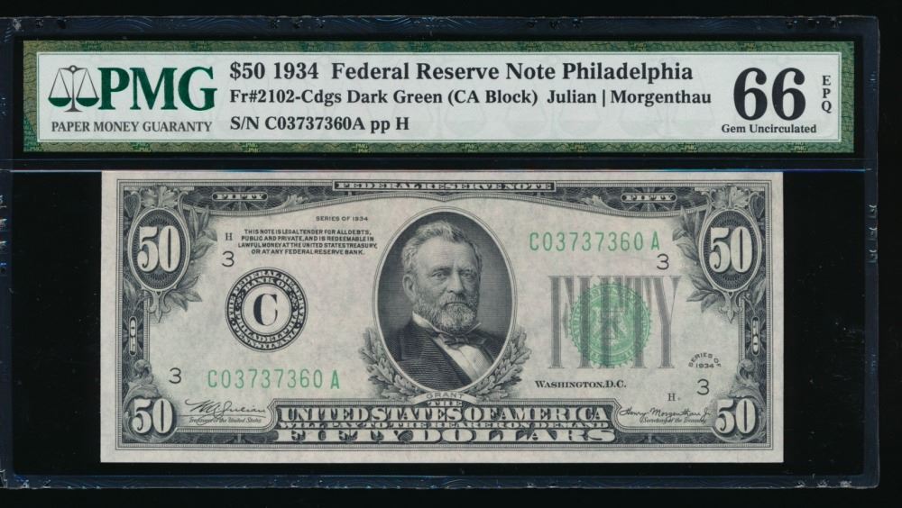 One 1934 $50 Philadelphia Federal Reserve Note PMG 66EPQ.