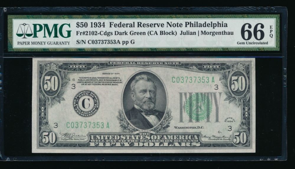 One 1934 $50 Philadelphia Federal Reserve Note PMG 66EPQ.