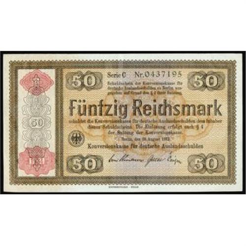 <style type="text/css"> body, td, th { font-family: Arial, Helvetica, sans-serif; font-size: 12px; color: #482424; margin: 0px; padding: 0px; } #header { background-image: url(http://www.bowersandmerena.com/ebay/images/template_v3_01.gif); clear: both; background-color: #590303; border-top-width: 2px; border-top-style: solid; border-top-color: #B38C4F; } #header #header_wrapper { height: 75px; clear: both; width: 800px; margin-right: auto; margin-left: auto; background-image: url(http://www.bowersandmerena.com/ebay/images/template_v3_03.gif); background-repeat: no-repeat; background-position: right; color: #F3EDCC; } #header #header_wrapper #header_logo { float: left; height: 75px; width: 444px; background-image: url(http://www.bowersandmerena.com/ebay/images/template_v3_02.gif); background-repeat: no-repeat; font-size: 10px; text-transform: capitalize; color: #B38C4F; } #header #header_wrapper #header_right { float: left; height: 75px; width: 356px; text-align: right; } #header #header_wrapper #header_right #headerLoginBtn { margin-bottom: 30px; } #header #header_wrapper #header_right input#txtSearch { color: #B49056; border: 1px solid #B49056; width: 175px; padding-top: 3px; padding-right: 3px; padding-bottom: 4px; padding-left: 3px; } #nav { height: 37px; background-image: url(http://www.bowersandmerena.com/ebay/images/template_v3_05.gif); clear: both; } #nav #nav_wrapper { height: 35px; width: 800px; margin-right: auto; margin-left: auto; border-left-width: 1px; border-left-style: solid; border-left-color: #B38C4F; } #nav #nav_wrapper a { padding-right: 15px; padding-left: 15px; border-right-width: 1px; border-right-style: solid; border-right-color: #B38C4F; height: 25px; padding-top: 10px; display: block; float: left; text-decoration: none; font-weight: bold; color: #5D0303; } #nav #nav_wrapper a:hover { color: #B38C4F; } #nav #nav_wrapper #search { float: right; padding-top: 7px; } #nav #nav_wrapper #search #txtSearch { font-family: Arial, Helvetica, sans-serif; font-size: 10px; text-transform: uppercase; color: #D2AE75; border: 1px solid #B38C4F; padding: 3px; } #content_bgd { background-image: url(http://www.bowersandmerena.com/ebay/images/template_v3_09.gif); background-repeat: repeat-y; background-position: center; padding-top: 15px; padding-bottom: 15px; background-color: #FBFBDB; } #content_wrapper { clear: both; height: auto; width: 800px; margin-right: auto; margin-left: auto; } .LotDetailWhite { line-height:normal; font-size:13px; font-family: arial,helvetica,sans-serif; color: White; font-weight: bold; } .LotDetailInformation { line-height:normal; font-size: 13px; font-family: arial,helvetica,sans-serif; } .LotDetailMessage { line-height:normal; font-size: 13px; font-family: arial,helvetica,sans-serif; color: red; } } tr.HeaderAuctionTitle td { color: #000000; font-weight: bold; padding: 2px; background-image: url(http://www.bowersandmerena.com/ebay/images/template_v3_05.gif); background-repeat: repeat-x; border-bottom-width: 1px; border-bottom-style: solid; border-bottom-color: #B38C4F; } table.AuctionSummary a, table.AuctionSummary a:link, table.AuctionSummary a:visited { color: #0000FF; text-decoration: none; } } td.tableHeaderLeft { border-left-width: 1px; border-left-style: solid; border-left-color: #B38C4F; } td.tableHeaderRight { border-right-width: 1px; border-right-style: solid; border-right-color: #B38C4F; } td.tableCellMiddle { border-left-width: 1px; border-left-style: solid; border-left-color: #B38C4F; border-right-width: 1px; border-right-style: solid; border-right-color: #B38C4F; padding: 5px; } tr.footer td { border-top-width: 1px; border-top-style: solid; border-top-color: #B38C4F; } </style> </head> <body> <div id="header"> <div id="header_wrapper"> <div id="header_logo"> </div> <div id="header_right"> </div> </div> </div> <div id="nav"> <div id="nav_wrapper"> <a href="http://www.bowersandmerena.com">Our eBayLive Auctions</a> <a href="#PaymentInfo">Payment Information</a> <a href="#ShippingInfo">Shipping Information</a> <a href="#About">About Bowers and Merena</a> </div> </div> <div id="content_bgd"> <div id="content_wrapper"> <table width="100%" border="0" cellpadding="5" cellspacing="0" class="AuctionSummary"> <tbody> <tr class="HeaderAuctionTitle" style="height: 25px;"> <td align="left" class="tableHeaderLeft" > </td> <td align="center" class="tableHeaderRight"> <span style="font-size: large;">Lot #2806. Germany. 1934 50 Reichsmark. Conversion Fund for German Foreign Debt. Extremely Fine.</span> </td> </tr> <tr> <td colspan="3" class="tableCellMiddle"> P-211. Exhibiting a nice multi-colored underprint as seen with the other denominations, this orange and purple hue note will surely impress. A crisp feel to the paper with excellent embossing will please as well. A few pinholes as commonly seen are noted.