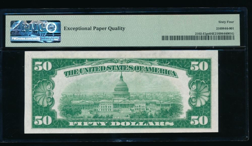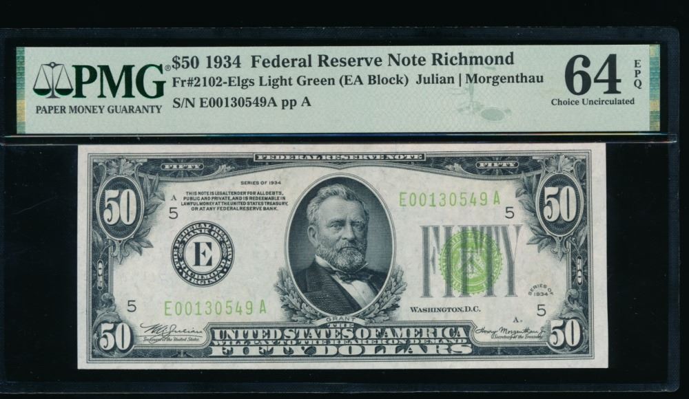 One 1934 $50 Richmond FRN PMG 64EPQ.