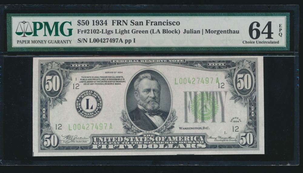 One 1934 $50 San Francisco FRN PMG 64EPQ.