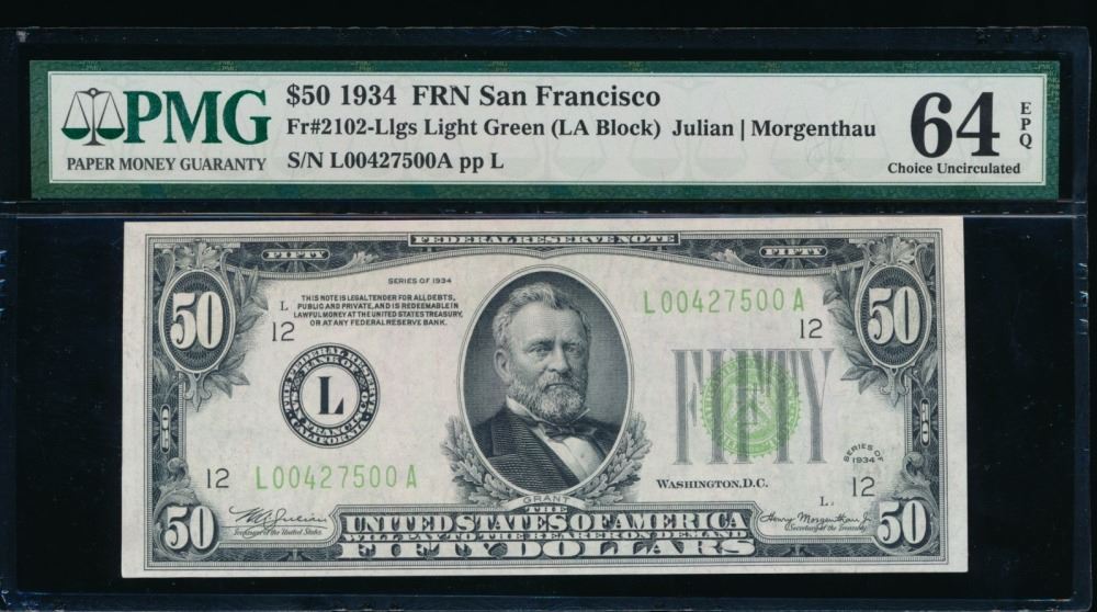One 1934 $50 San Francisco FRN PMG 64EPQ.