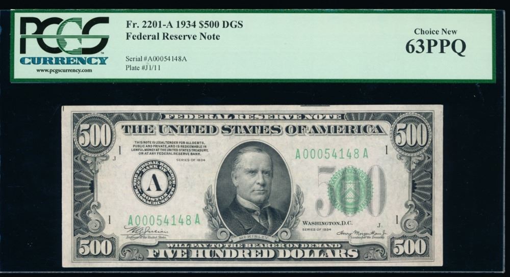 One 1934 $500 Boston Federal Reserve Note PCGS 63PPQ.