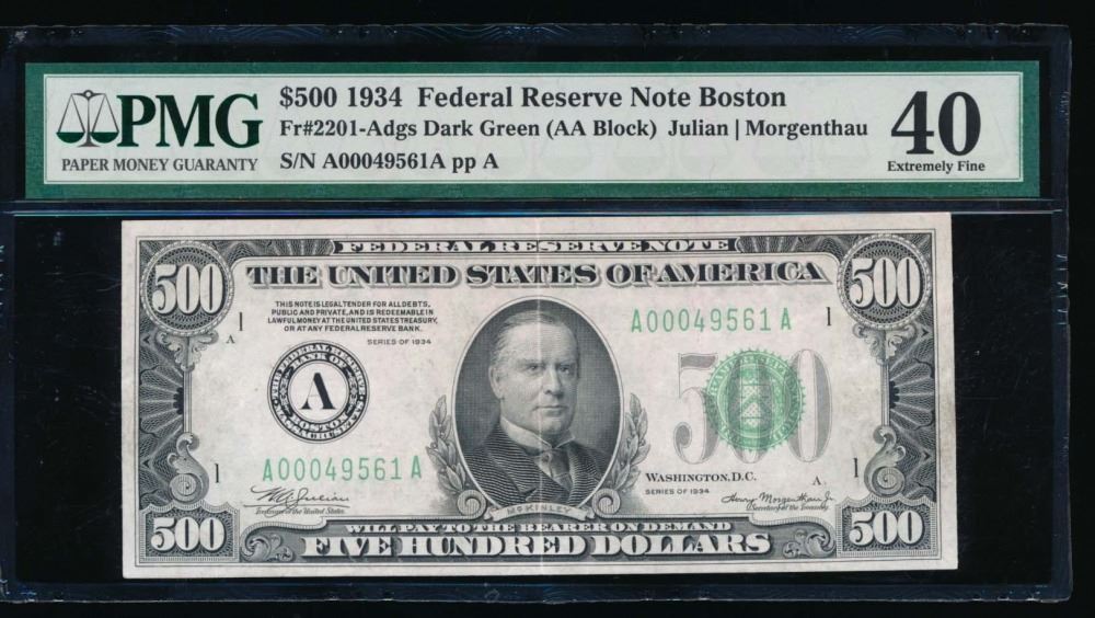 One 1934 $500 Boston Federal Reserve Note PMG 40.