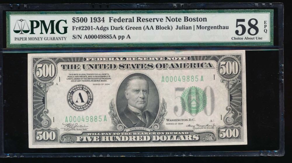 One 1934 $500 Boston Federal Reserve Note PMG 58EPQ.