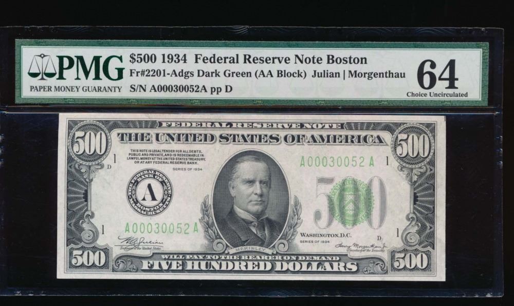 One 1934 $500 Boston Federal Reserve Note PMG 64.
