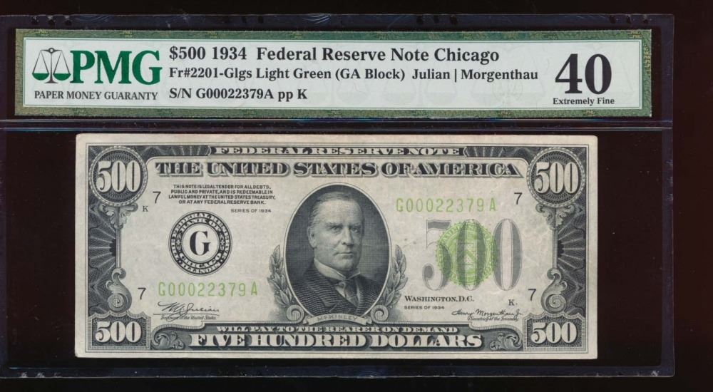 One 1934 $500 Chicago Federal Reserve Note PMG 40.