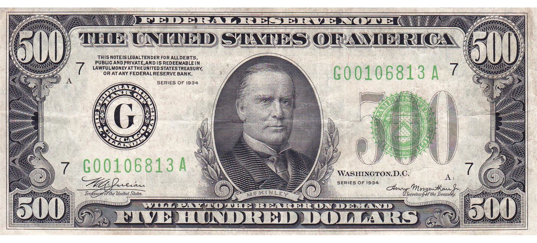 One 1934 $500 Federal Reserve Note Chicago.