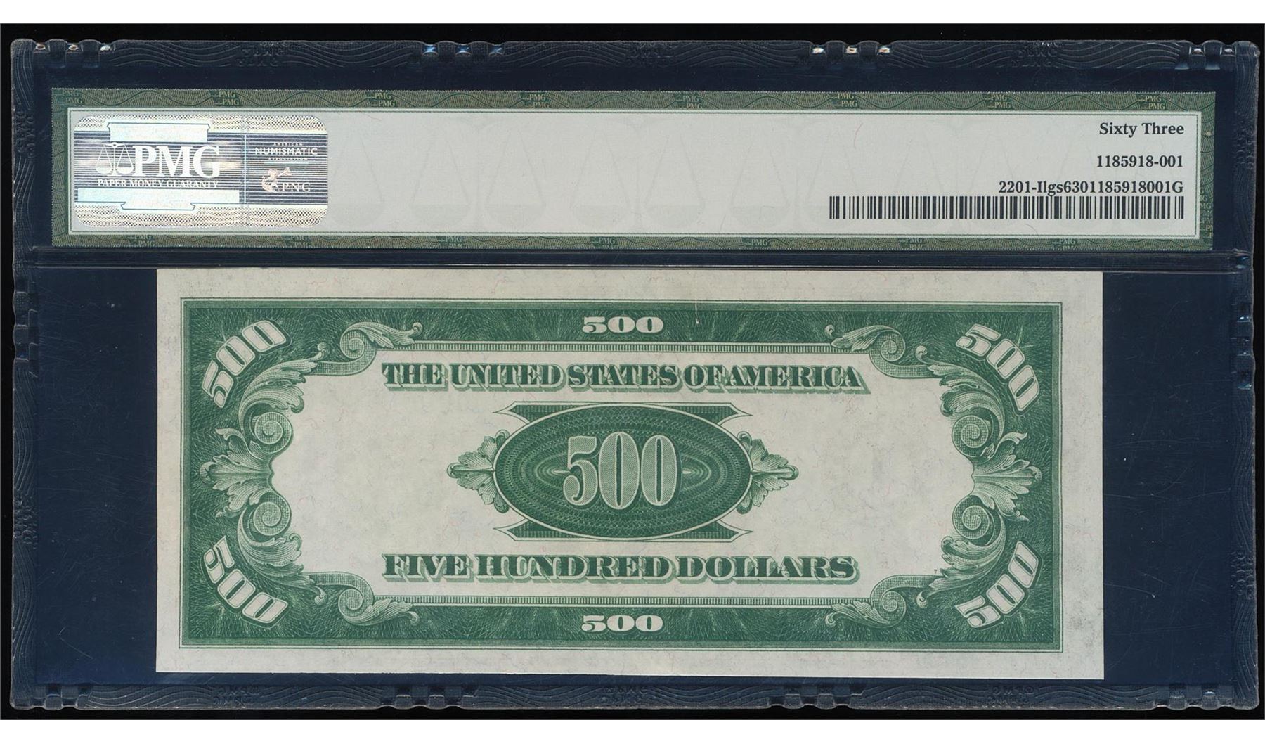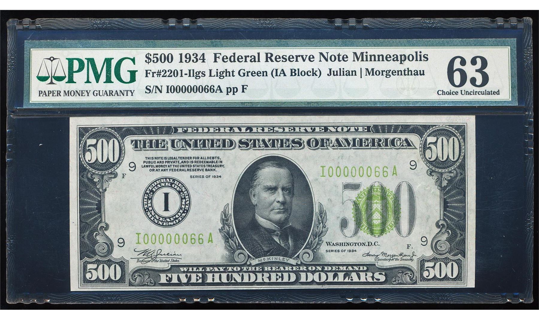 One 1934 $500 Federal Reserve Note Minneapolis PMG Choice Unc. 63 Low Serial Light Green. PMG Certified.
