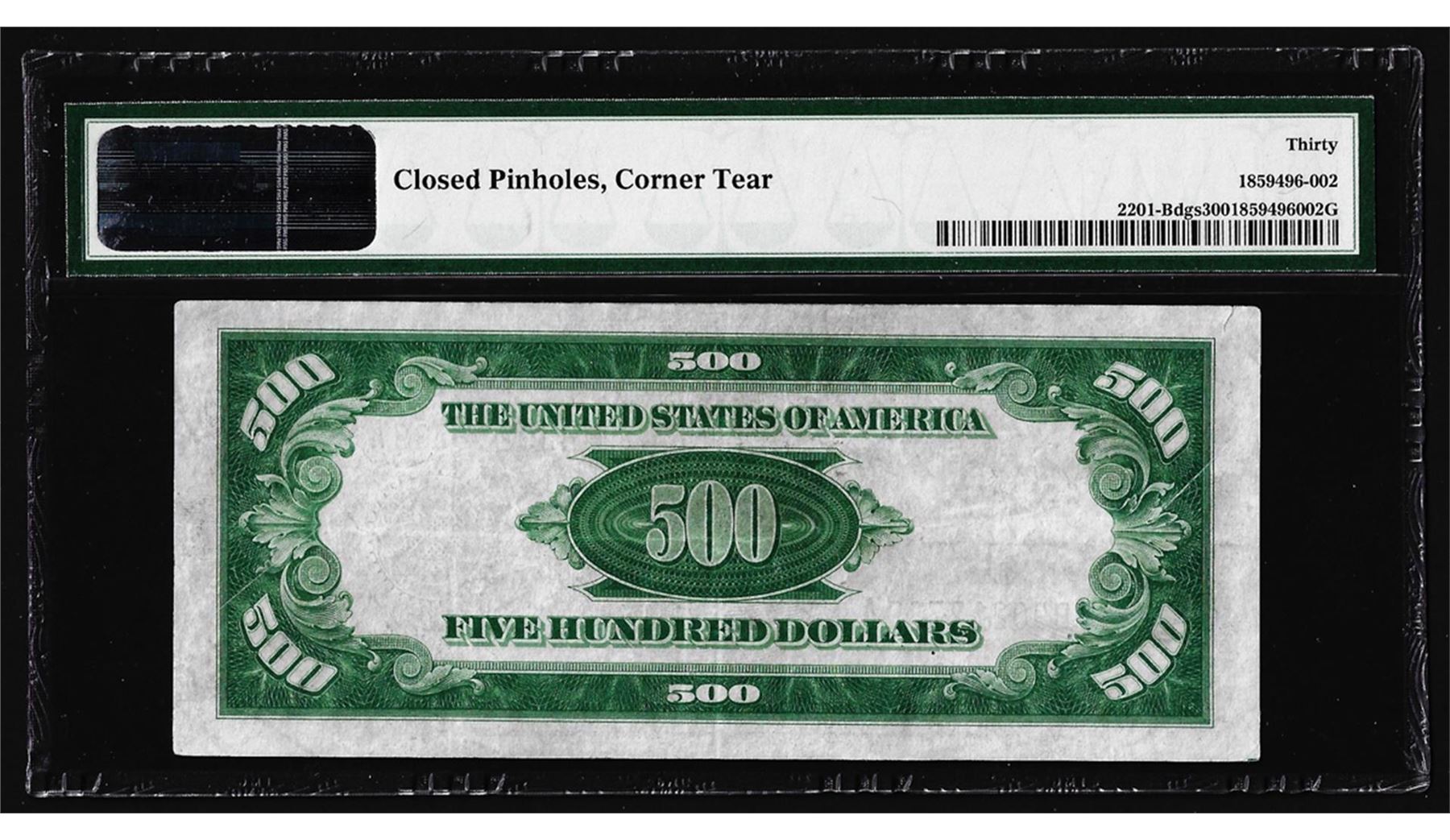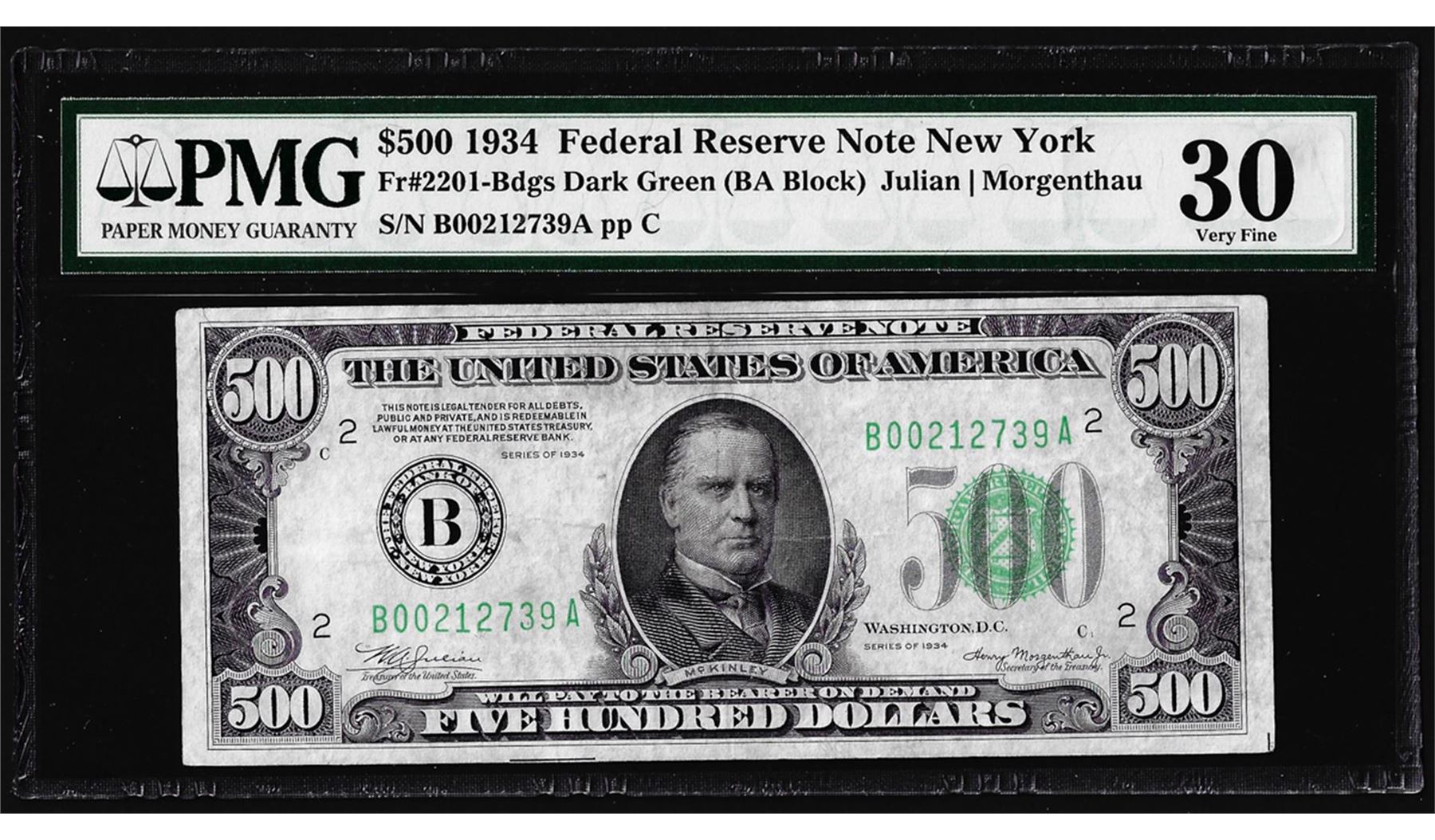 One 1934 $500 Federal Reserve Note New York Fr.2201-B PMG Very Fine 30. PMG Certified.